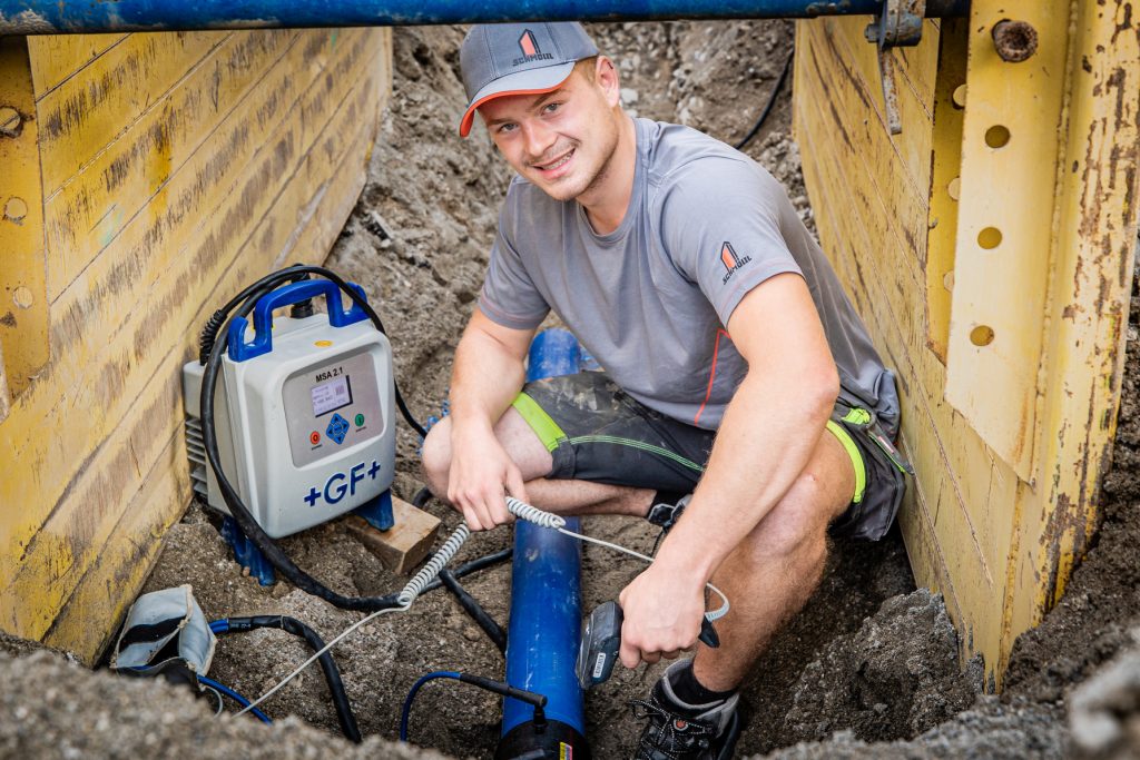 Die Antwort darauf ist eigentlich ganz einfach: Durch die hochprofessionelle Arbeit unserer Rohrleitungsbauerinnen und Rohrleitungsbauer. Sie heben mit schwerem Gerät teils metertiefe Gräben aus, sichern diese für sicheres Arbeiten ab und verlegen anschließend mit höchster Präzision und verblüffender Routine die oft kilometerlangen Leitungen. Diese können aus den verschiedensten Materialien wie Beton, Kunststoff, Steinzeug oder massivem Stahl bestehen und werden je nach Anforderungen absolut dicht verschraubt oder verschweißt um später unfassbarem Druck standzuhalten, oder zusammen gesteckt oder geklebt um in der Zukunft wieder leicht trennbar zu sein.